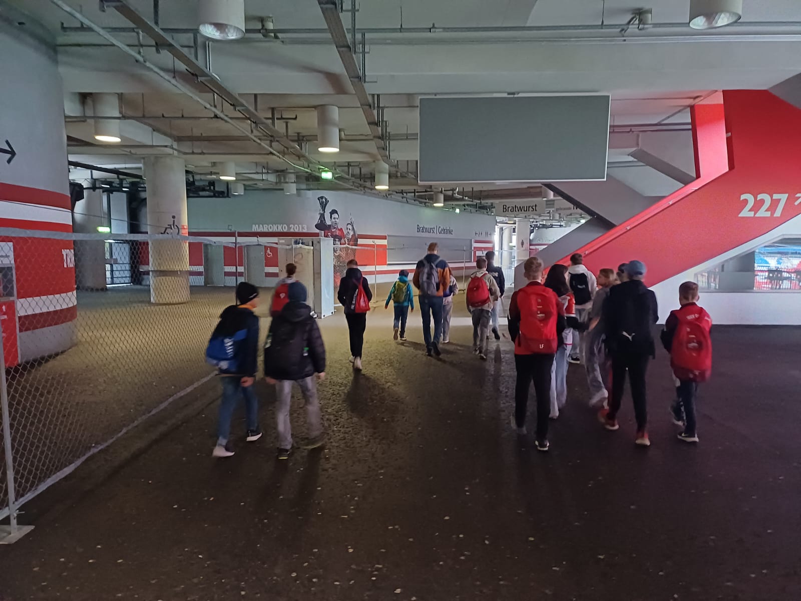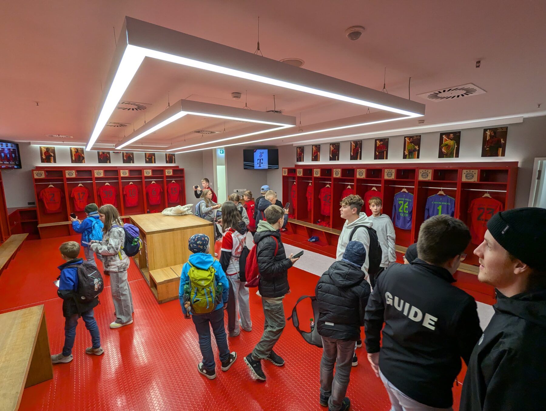 Während des Rundgangs bot sich zunächst vom Mittelrang der Südkurve ein beeindruckender Blick über das gesamte Stadion. Anschließend führte die Tour in den Kabinentrakt, wo die Besucher:innen einen Eindruck davon bekamen, wie sich Spieler und Trainer vor einem Spiel vorbereiten. Ein besonderes Erlebnis war der Gang durch den Spielertunnel bis an den Spielfeldrand, wo die Arena aus der Perspektive der Profis betrachtet werden konnte – direkt bei den Trainerbänken.